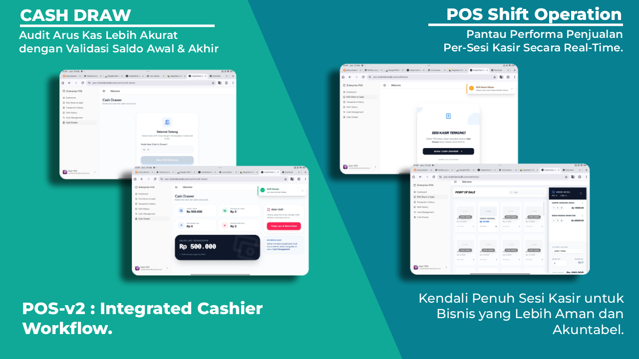Pembaruan v2.0 menangani tantangan akurasi finansial dengan memastikan tidak ada celah antara pencatatan sistem dan uang fisik di tangan kasir melalui alur kerja yang terintegrasi.